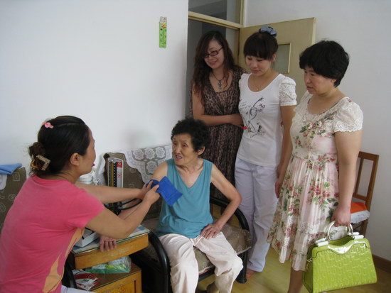 目前,“關(guān)愛空巢老人,?;丶铱纯础币蚜腥敕蓷l文,老人心靈深處的那種孤獨,寂寞牽動著整個社會的神經(jīng),也牽動著我們每個人的心。隨著在職黨員進社區(qū)活動的深入開展,財務(wù)支部,外科支部與吉祥園社區(qū)侯書記取得了聯(lián)系,于7月25日上午購買了糕點,水果,帶著血壓計去看望兩位空巢老人。一位是於寶蘭老人,今年75歲,是位老黨員,老伴已去世七八年,她的四個孩子都在外面打工。上午九點多,大家來到老人家,老人家收拾的非常整潔,干凈,桌面地板擦拭的一塵不染,她心態(tài)非常好,經(jīng)常到老年大學(xué)參加活動。她不打麻將,不打撲克,不喜歡在樓下閑聊天,最大的愛好就是寫字,畫畫,在生活中自己去找樂兒,提及孩子,她非常理解子女在外打工,平日都挺忙的,回趟家非常不容易。想孩子的時候,就拿出照片看看,就覺得孩子們仿佛就在身邊。